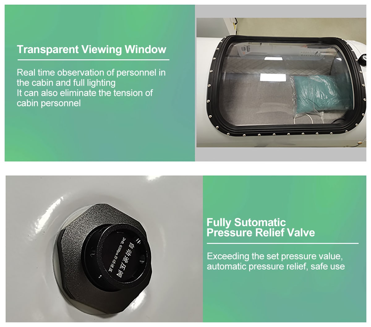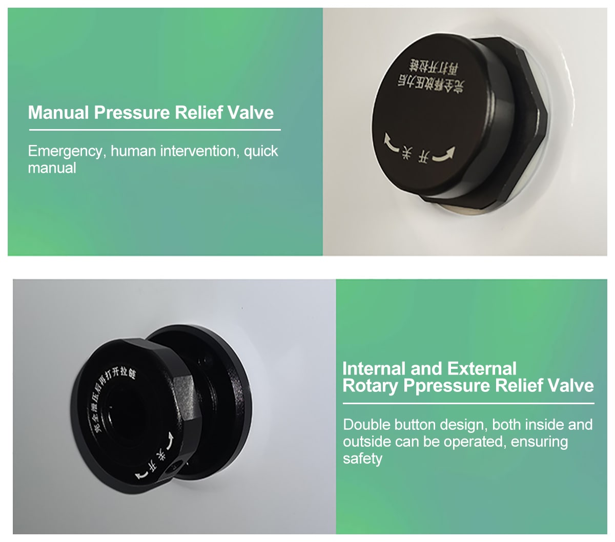 Veiligheid staat voorop en onze kamer beschikt over een automatisch luchtdrukcontrolesysteem. Het bevat een nooddrukontlastklep in de kamer, waardoor in geval van nood een snelle drukverlaging mogelijk is.