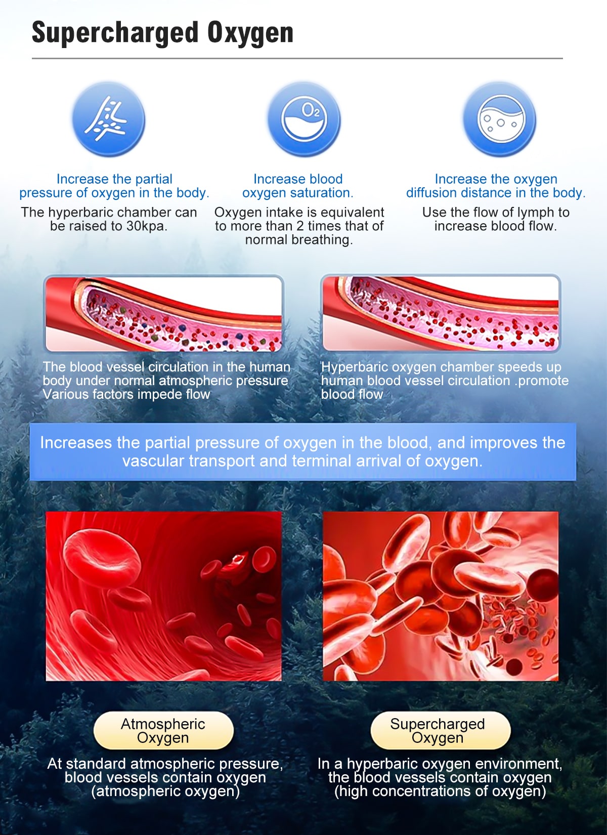 Zuurstof is een element dat essentieel is voor elke cel in ons lichaam, maar naarmate we ouder worden en de milieuvervuiling toeneemt, begint ons lichaam deze essentiële voedingsstof te missen. In tegenstelling tot andere elementen kunnen we de zuurstof in ons lichaam niet aanvullen door medicijnen te nemen of onze voeding te veranderen. Bij normale luchtdruk zijn onze zuurstofdragende cellen verzadigd en kunnen daarom niet meer zuurstof naar ons lichaam transporteren. Tijdens hyperbare zuurstoftherapie wordt het lichaam zachtjes onder druk gezet, waardoor een omgeving ontstaat waarin zuurstof direct in het bloed, de weefsels en andere lichaamsvloeistoffen kan oplossen, waardoor het zuurstofniveau in de cellen aanzienlijk toeneemt en een grotere energieproductie wordt geactiveerd. Deze toename van energie kan de coping-mechanismen van het lichaam helpen ondersteunen bij veroudering, stress en andere situaties waardoor we ons minder dan 100% voelen.